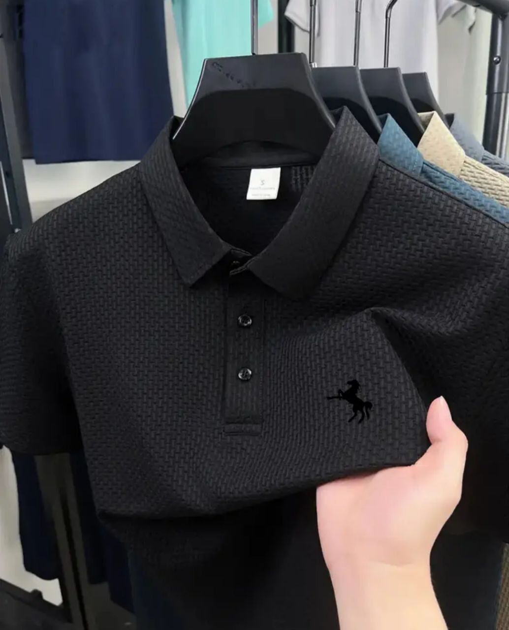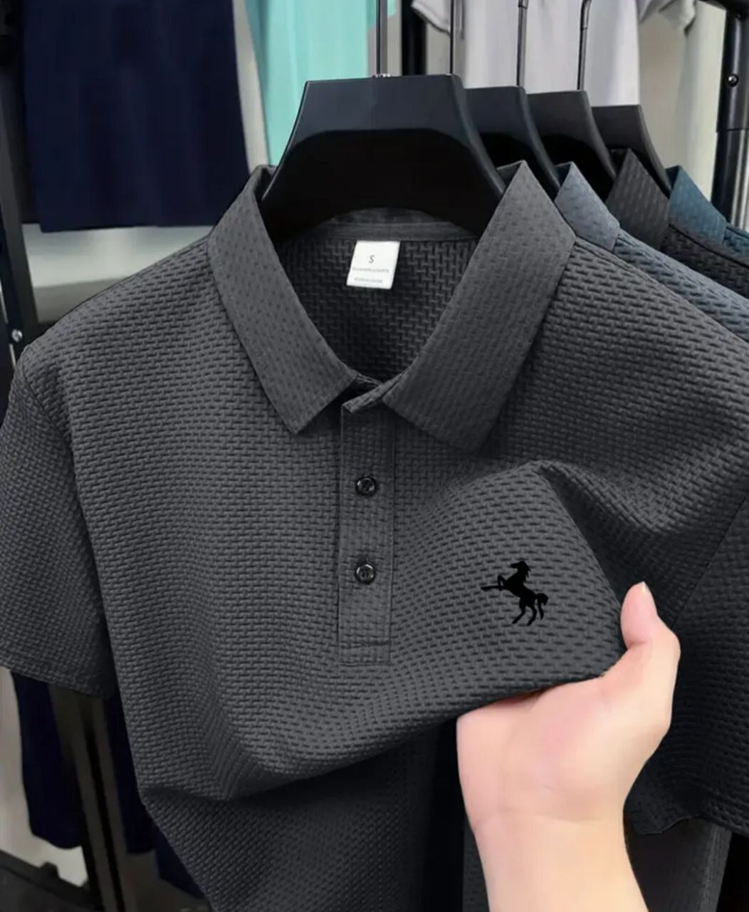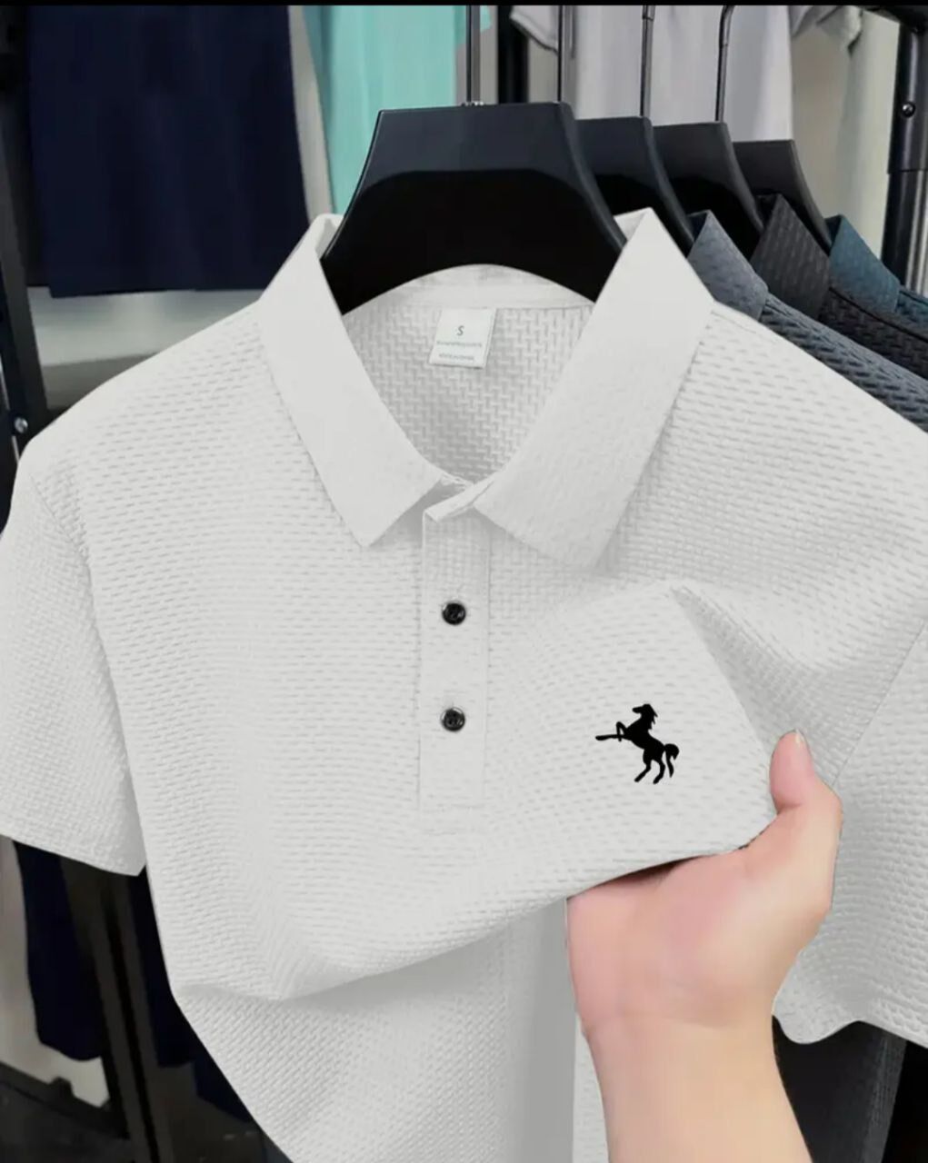 Pánske pohodlné tričko s originálnou potlačou skákajúceho koňa. Ľahký, priedušný materiál a ležérny polo dizajn sú ideálne na obchodné aj voľnočasové nosenie.