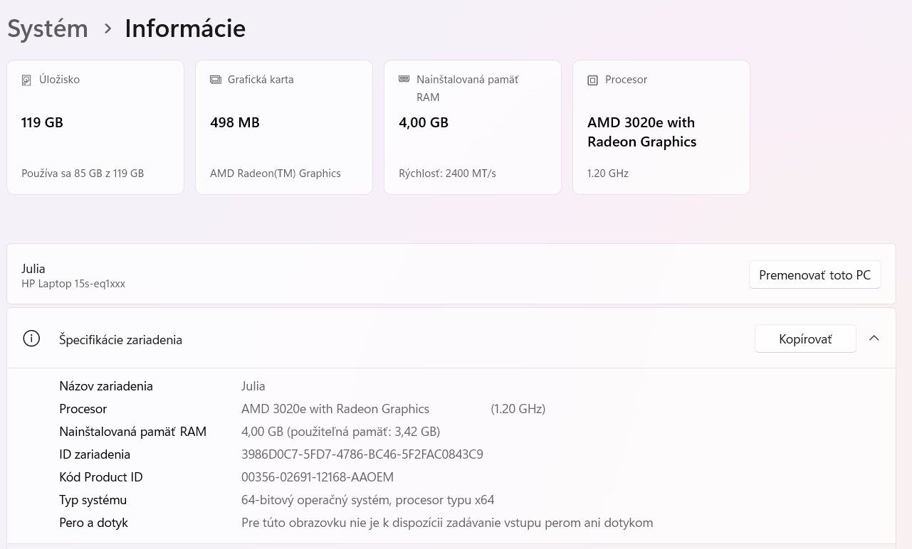 Predávam svoj notebook. Je vhodný na bežnú kancelársku prácu, sledovanie videí, prácu s textovými dokumentmi a používanie niektorých pracovných programov. Dá sa na ňom tiež hrať niektoré počítačové hry (na minimálnych alebo stredných grafických nastaveniach v závislosti od hry).