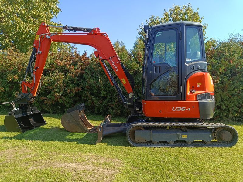 Prodám minibagr Kubota U36-4, rok výroby 2019, hmotnost 3900 Kg, motohodin 1553, nulová otoč, 2 x hydraulické vývody na kladivo, atd. 2 x rychlost pojezdu, rychloupínák Lehnhoff MS 03, 1 x podkopová lžíce 50 cm, 1 x hydraulická naklápěcí svahovací lžíce 100 cm. Cena uvedena bez DPH.