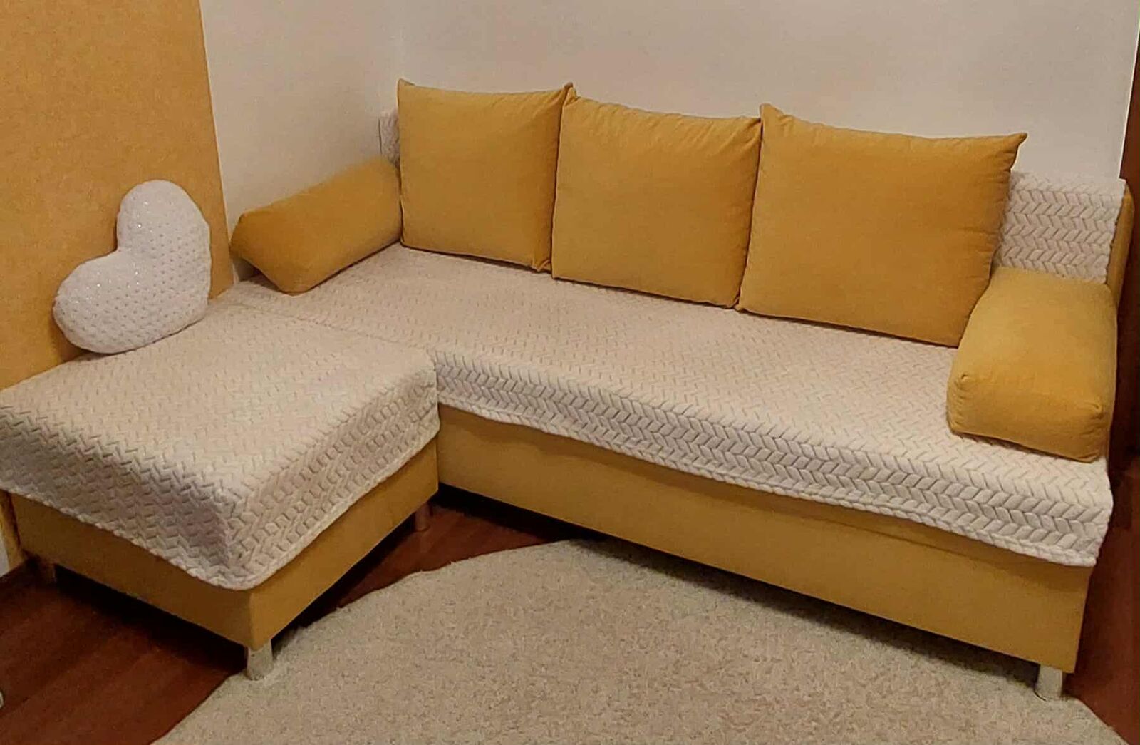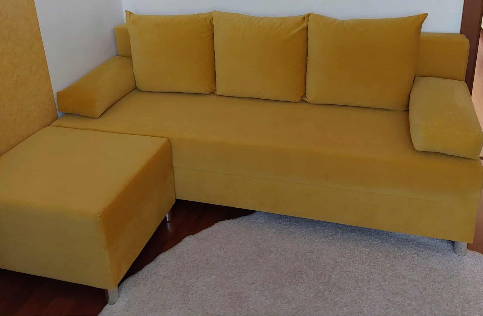 Predám Rozkladaciu pohovku s úložným priestorom a taburetkou. Na pohovke pri stene je trocha látka poškodená , inak vo veľmi dobrom stave. Rozmery sú uvedené . Látka je Semiš a vankúše majú zips. Prehozy pri záujme GRÁTIS. LEN OSOBNÝ ODBER, kuriérom neposielam !!!