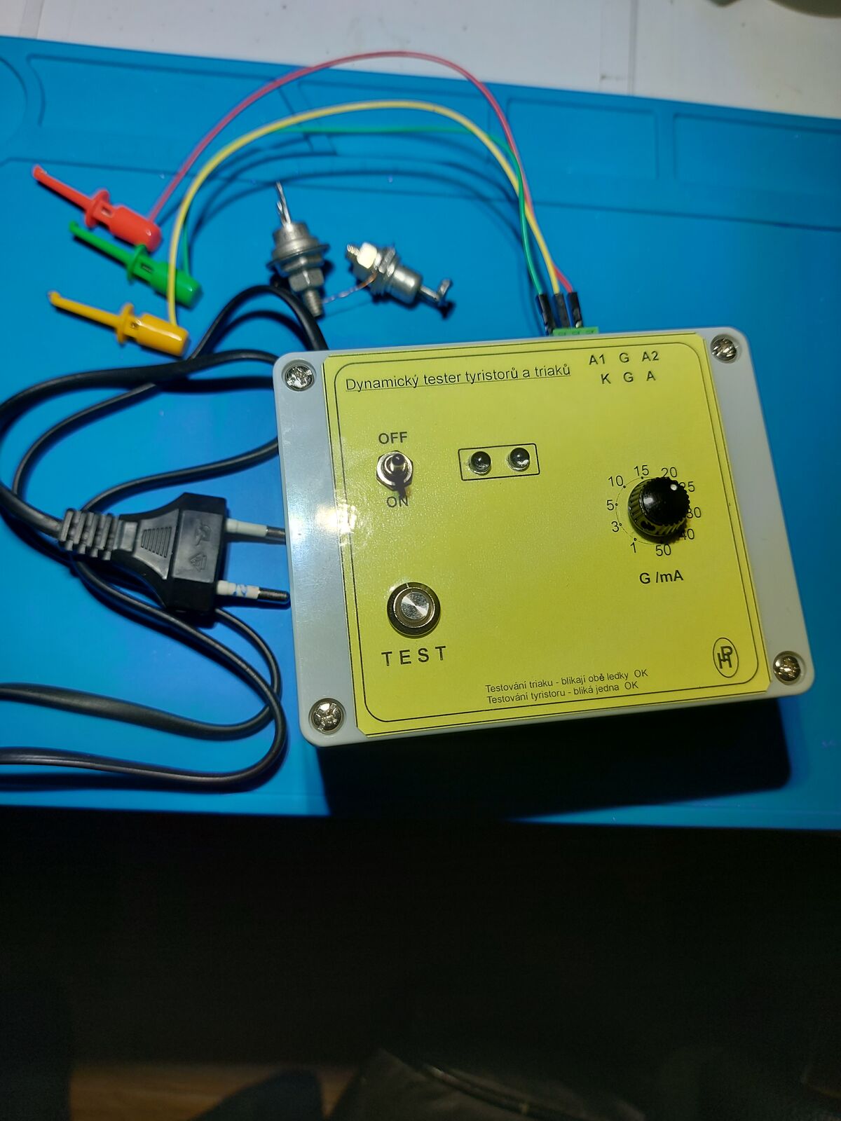 Tento dynamický tester triaků a tyristorů je koncipován jako část střídavá ( silová - K ,A nebo A1 a A2 ) a ovládací část stejnosměrná s regulovaným proudem do G - řídící elektroda. Regulovaná část je 10ti stupňová od 1mA do 50ti mA- stupnice na panelu přístroje.Hodnota proudové části se může mírně odlišovat od nastaveného proudu což je způsobeno technologií přechodu polovodičových struktur při součástkách od různých výrobců.Při testování obousměrného polovodiče svítí střídavě obě diody při jednosměrném přechodu svítí jen jedna z diod. Postup zkoušky polovodiče :připojíme testovací objekt podle předpisu na panelu, nastavíme nejnižší proud a tisknem tlačítko TEST,které v klidu červeně svítí.Nemáme-li odezvu led diod zvýšíme proud řepínačem a tisknem tlačítko.Takto postupujeme dokuď nebude reakce led diod,což ukazuje sepnutí součástky.Nebude-li svítit žádná z indikačních diod je pravděpodobně součástka vadná.Přečteme proud na přepínači.Připojení součástky je definováno v pravo hore předního panelu.Pomocí tohoto testeru simulujeme skutečné zapojení v provozu součástky a tím ověřujeme jeho funkčnost.Při zkouškách hlavě u triaku se může stát že se rozsvítí jen jedna dioda - prostě zvýšíme o stupeň proud do elektrody G a již svítí obě diody.