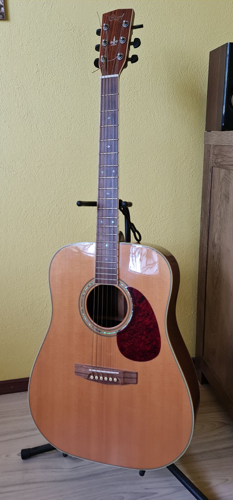 Akustická gitara CORT v super stave- málo používaná. Veľkosť 3/4, t.j. najbežnejšia. Laķ lesklý bez škrabancov. Silný sýty zvuk. Ladenie bezproblémové, drží. Krk je pevný a rovný. Vhodná pre pokročilejších aj začínajúcich hráčov. Cena je výhodná vzhľadom na pôvodnú cenu a kvalitu a stav gitary.