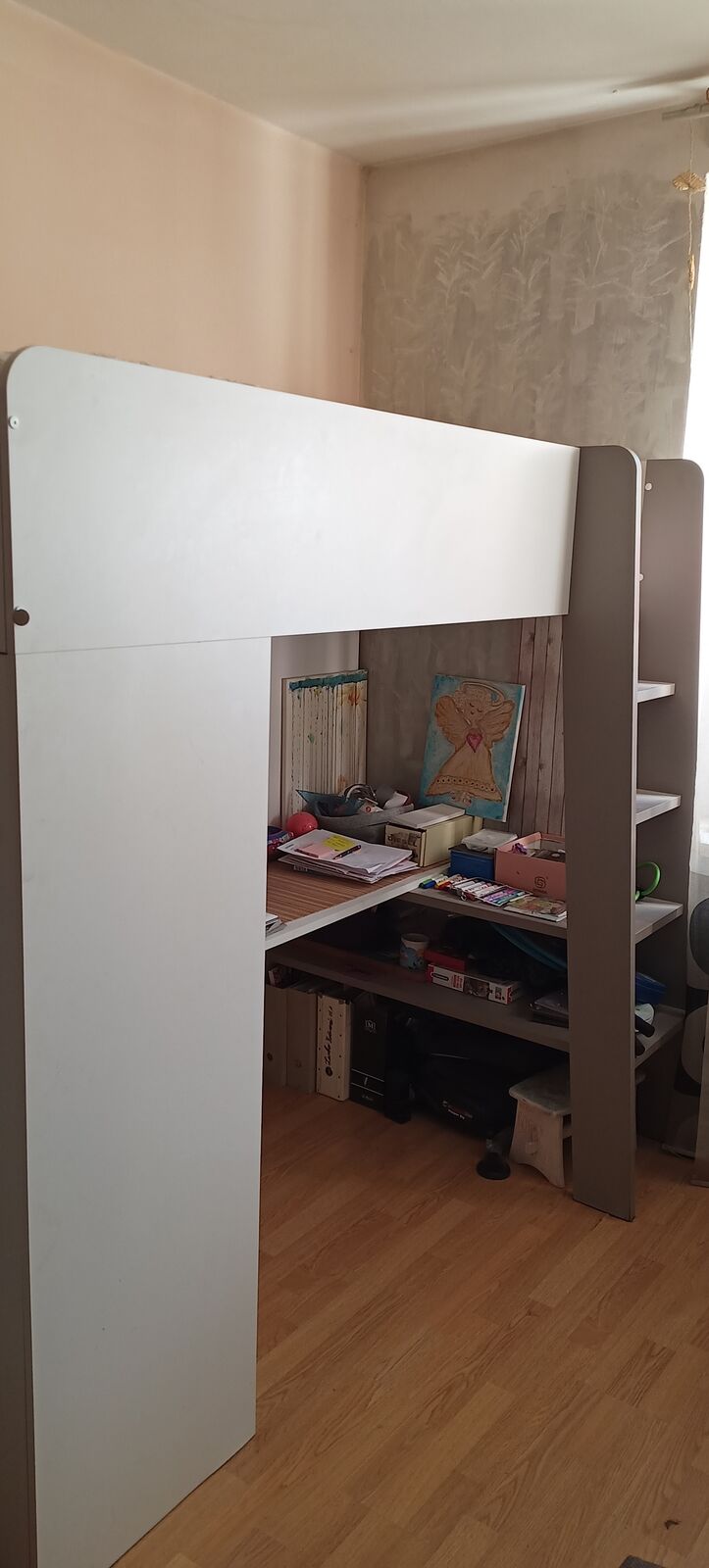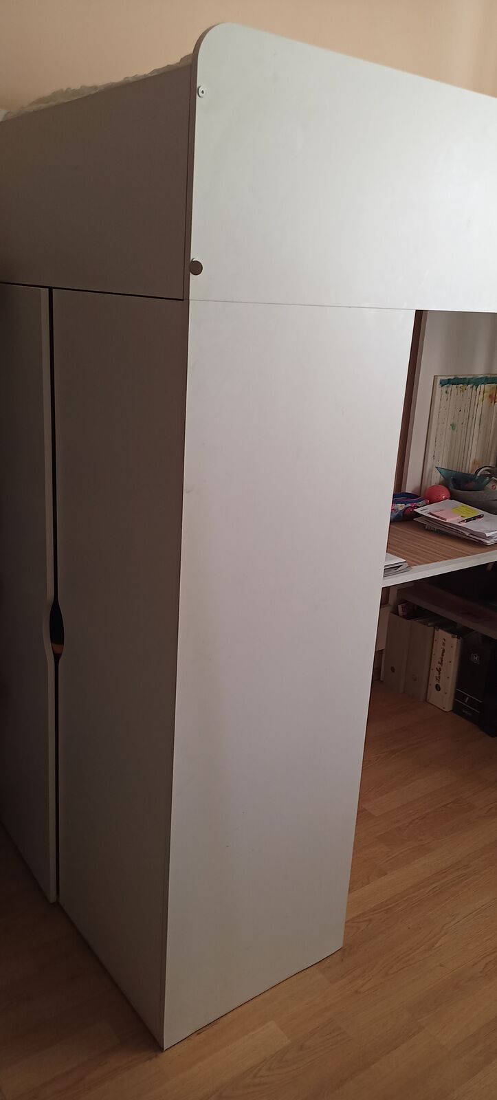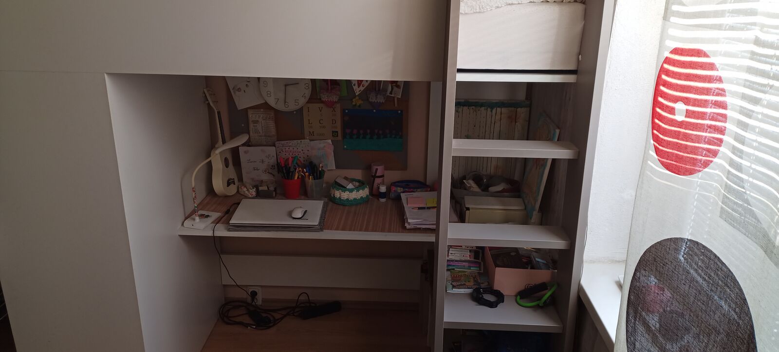Predám detskú poschodovú posteľ so skriňou a písacím stolom 90x200 Amster. Posteľ je opatrená zábranami. Súčasťou postele je rošt a nepoužívaný matrac Bonell, písací stôl a šatníková skriňa. Po obhliadke a dohode je možné detskú posteľ demontovať a pripraviť na odvoz.