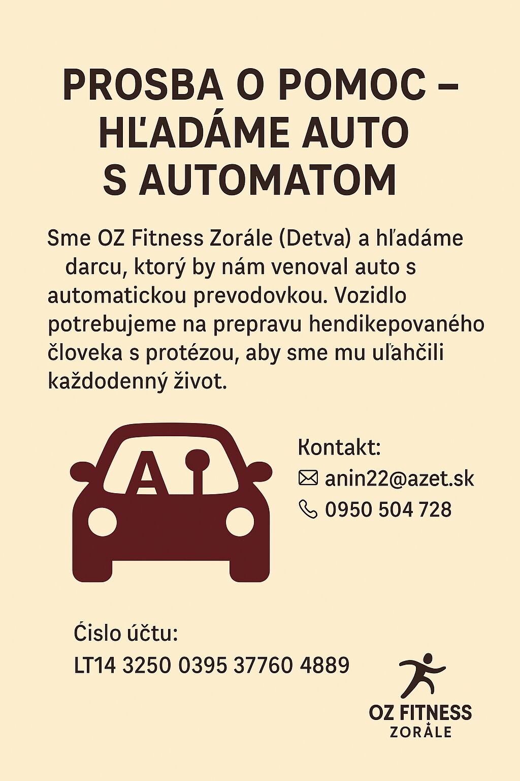 Občianske združenie OZ Fitness Zorále, Detva 962 12, sa obracia na Vašu organizáciu s prosbou o darovanie automobilu s automatickou prevodovkou.