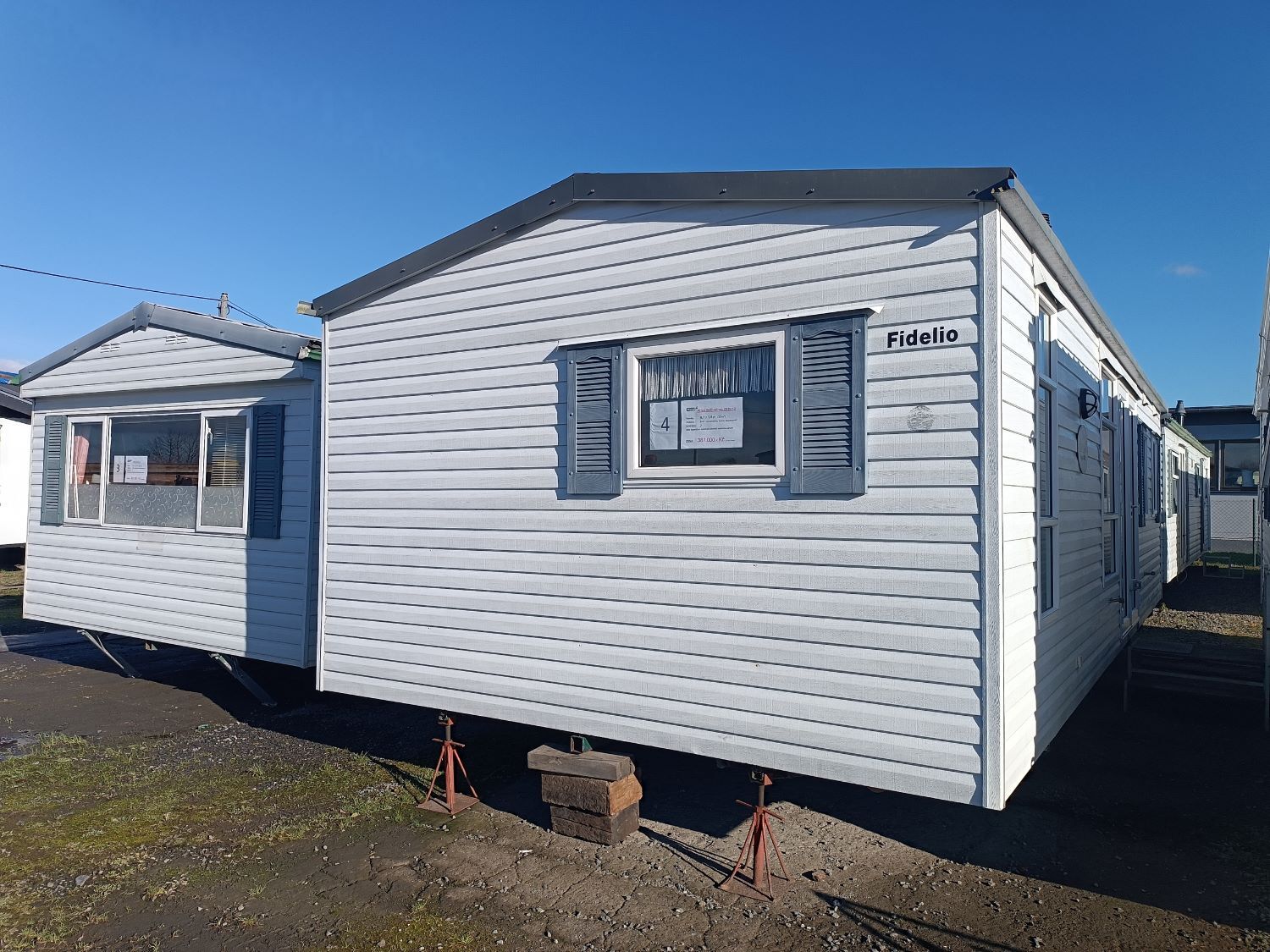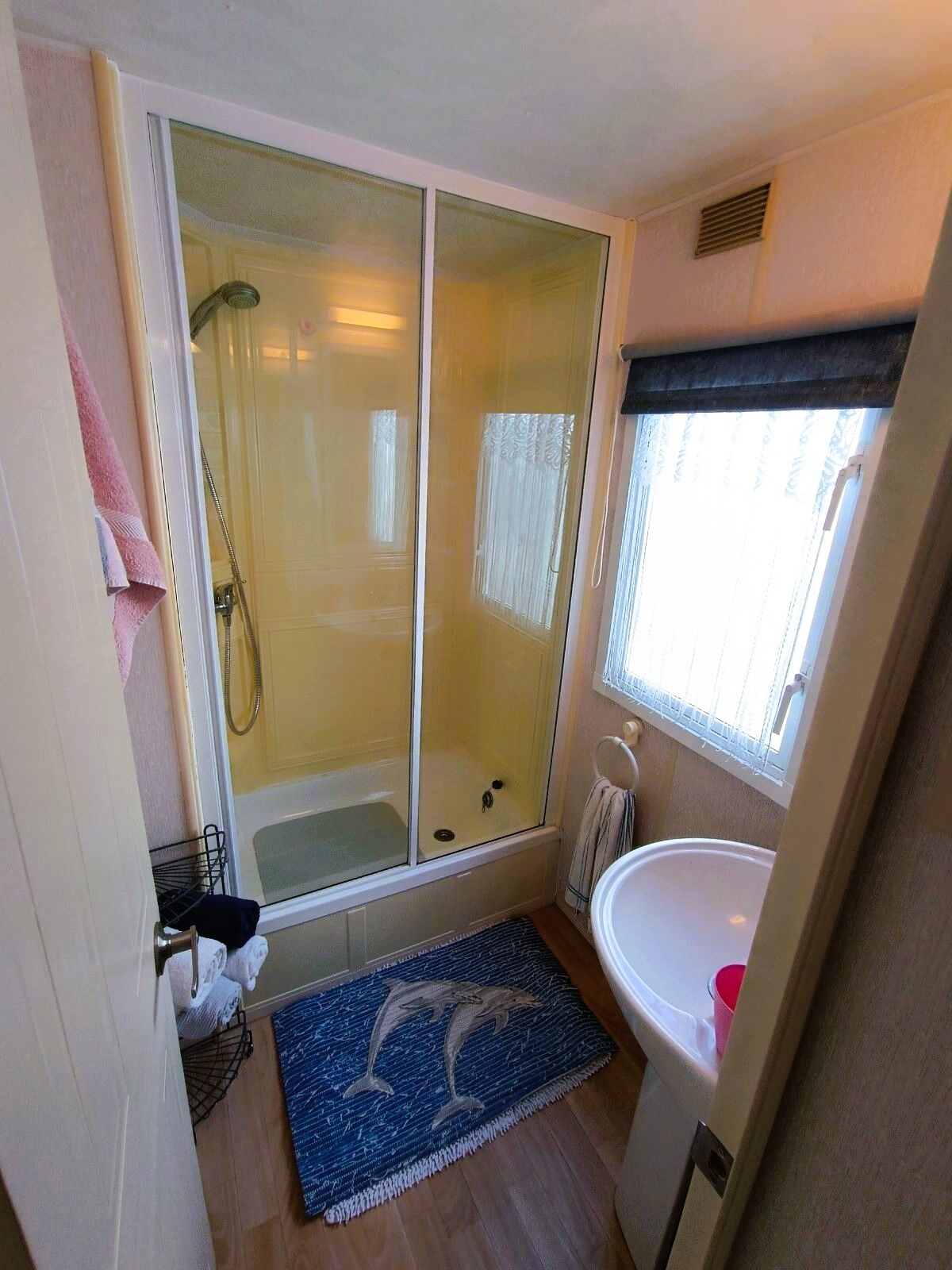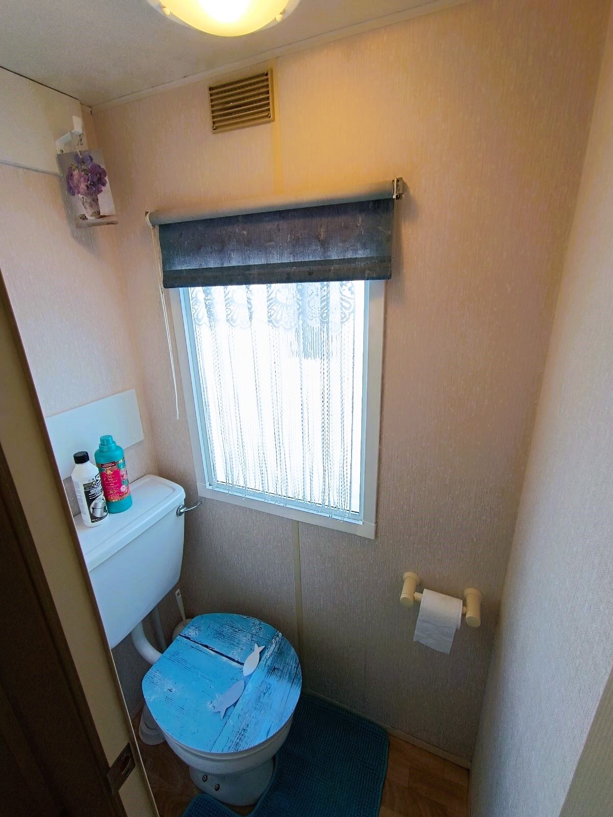 Atypický mobilný domček s hlavným vstupom umiestneným uprostred ponúka praktické a pohodlné dispozičné riešenie. Vďaka sedlovej streche má obytný priestor v obývacej izbe zvýšený strop, ktorý kopíruje jej tvar a dodáva miestnosti vzdušnosť aj svetlo. Interiér je vybavený jednoduchými plastovými oknami s látkovými roletami a na podlahe je položené jednoliate linoleum, praktické na každodennú údržbu.