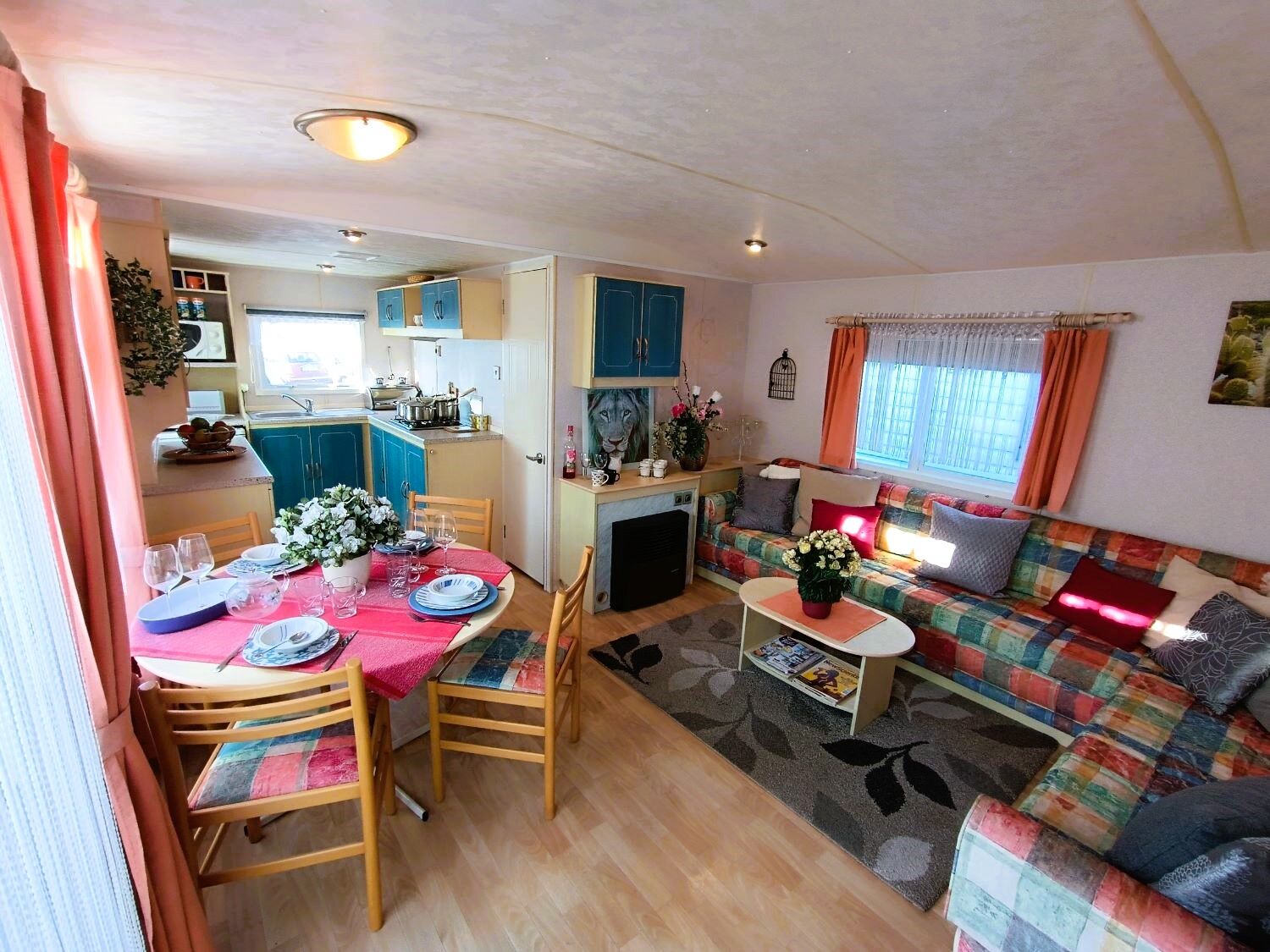 Hlavným vchodom sa vstupuje priamo do obývacej izby prepojenej s jedálenským kútom, ktorý vytvára príjemné spoločenské centrum domčeka. Je tu umiestnená veľká rozkladacia sedačka, využiteľná ako spací priestor na návštevy. Na obývaciu časť nadväzuje priestranná kuchyňa so štandardnými spotrebičmi a dostatkom pracovnej plochy.