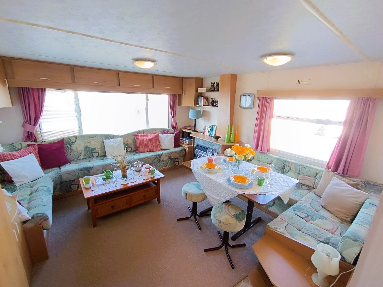 Dominantou domčeka je svetlý obývací priestor so vstavanou sedacou súpravou, ktorá poskytuje nielen pohodlné posedenie, ale aj praktické úložné priestory. K dispozícii je aj niekoľko úložných skriniek. Súčasťou obývacej časti je jedálenský kút s jedálenským stolom a sedacou súpravou v rovnakom štýle.