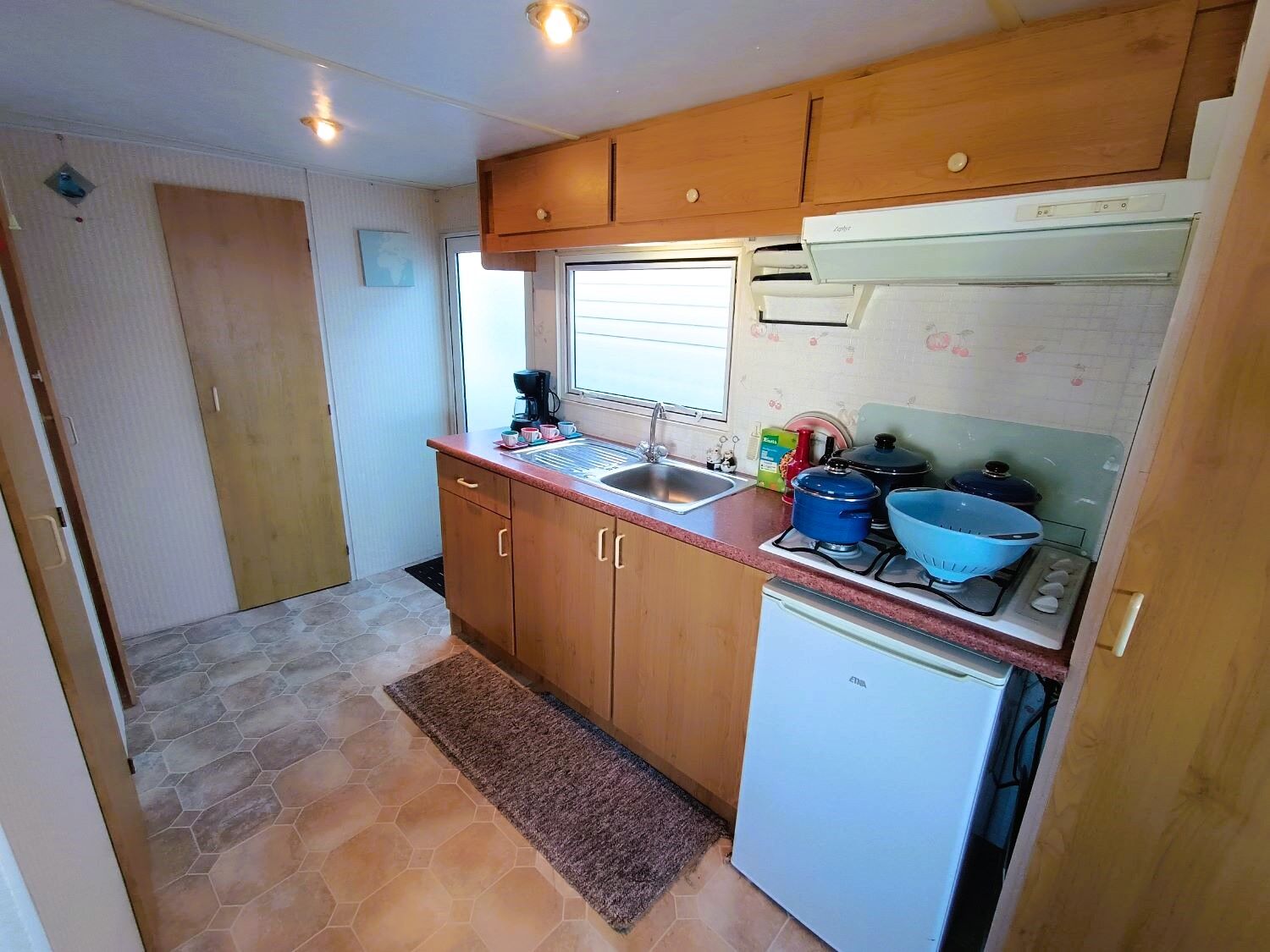 Kuchynská linka je umiestnená v širokej uličke, čo je na tento typ domčeka neobvyklé a zaisťuje dostatok priestoru na varenie aj pohyb. Nájdete tu klasické vybavenie: chladničku, nerezový plynový sporák, digestor a drez.