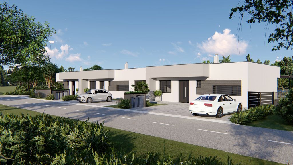 Dispozícia domov: hlavný vstup do rodinných domov je navrhnutý z východnej strany (od komunikácie). Vstupuje sa cez predsieň do chodby, z kadiaľ sú prístupné všetky obytné miestnosti rodinného domu. Z predsiene je prístup aj do WC a technickej miestnosti. Z chodby je prístupná denná časť, obývacia miestnosť s kuchyňou na jednej strane a na druhej strane je spálňa, druhé WC, kúpeľňa a na konci chodby dve izby. Z obývacej miestnosti je prístup na terasu. Dom B má k dispozícii garáž, ktorá je priechodná z prednej časti do záhrady.