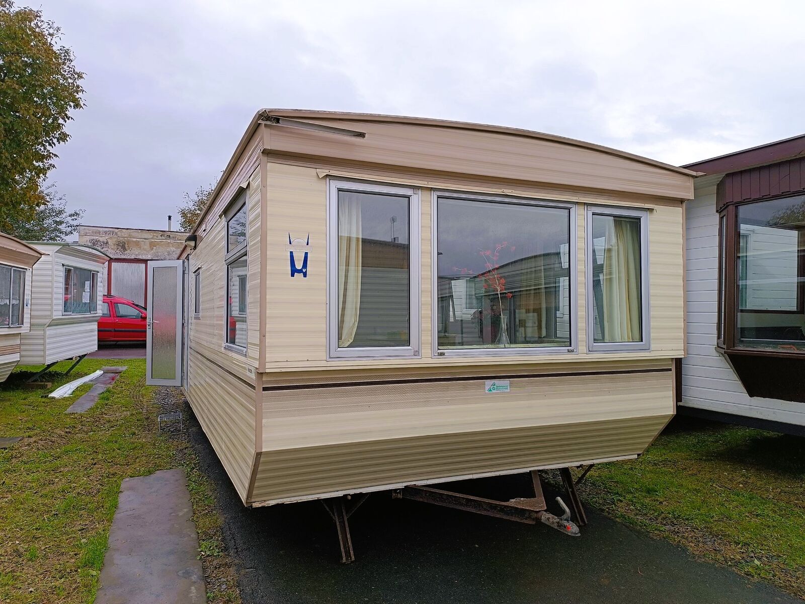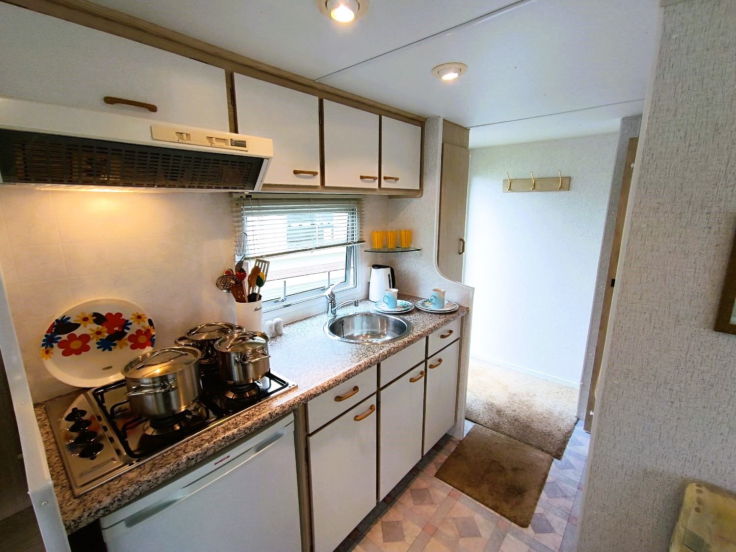 Praktický mobilný dom s ľavým vchodom, vhodný na rekreáciu aj ako zázemie na pozemok. Dispozícia 2+kk ponúka komfortný obývací priestor s jedálňou a kuchyňou vybavenou spotrebičmi (chladnička, sporák s digestorom, drez).