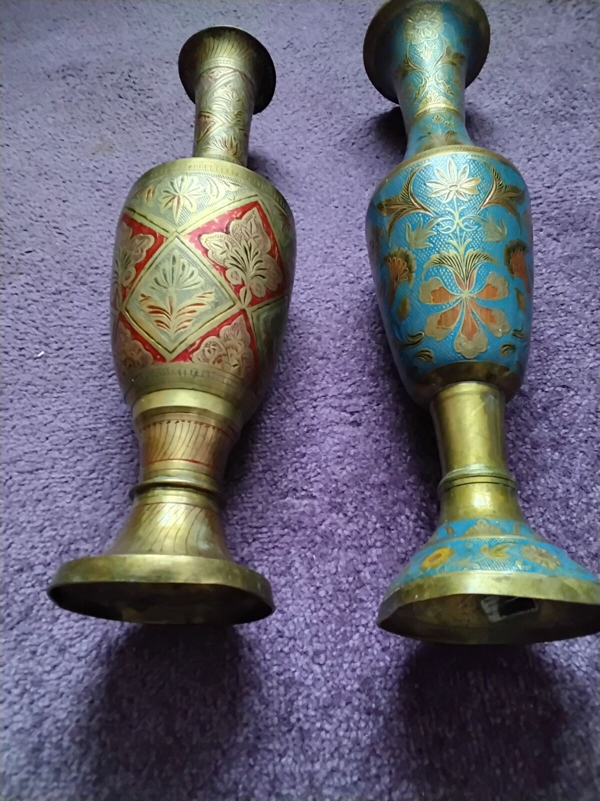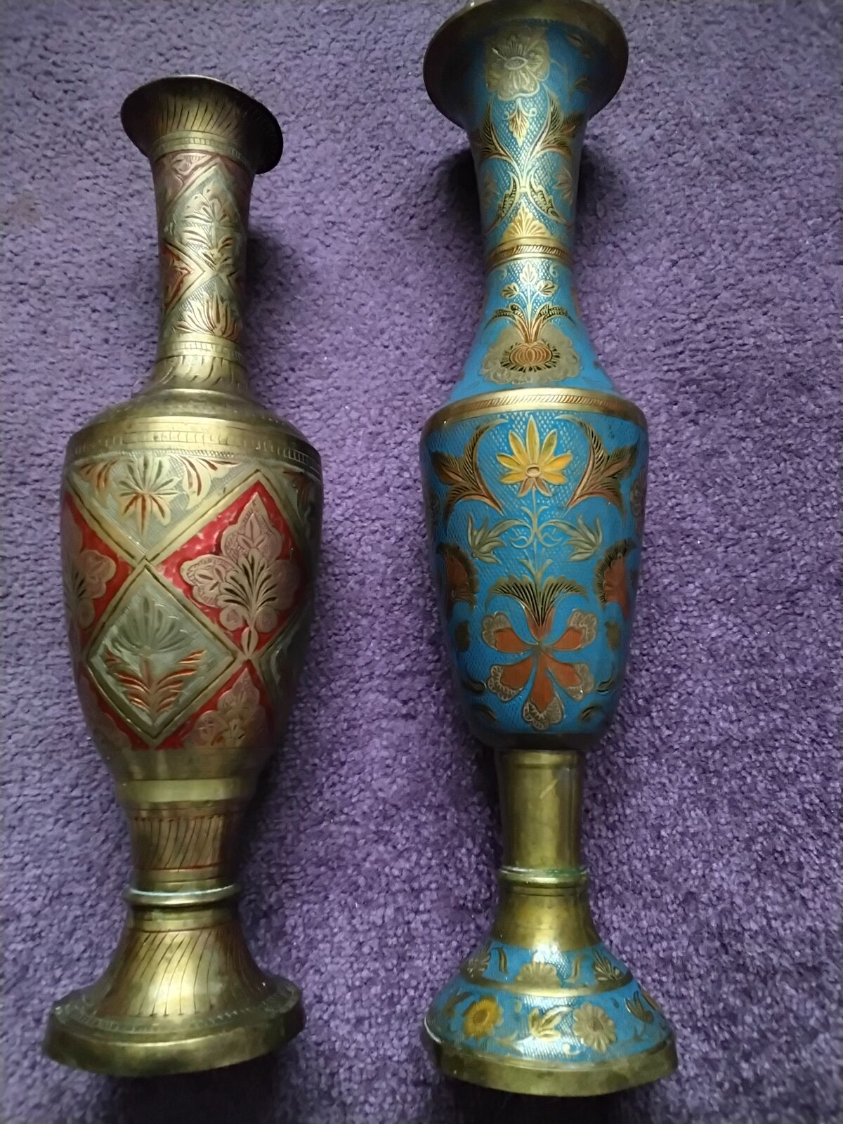 Predám dve staré mosadzné vázy. Rozmery ; ( v 43 cm , priemer 10 cm ) , ( v 40 cm , priemer 7,5 cm, 10 cm ). Cena je za jeden ks.