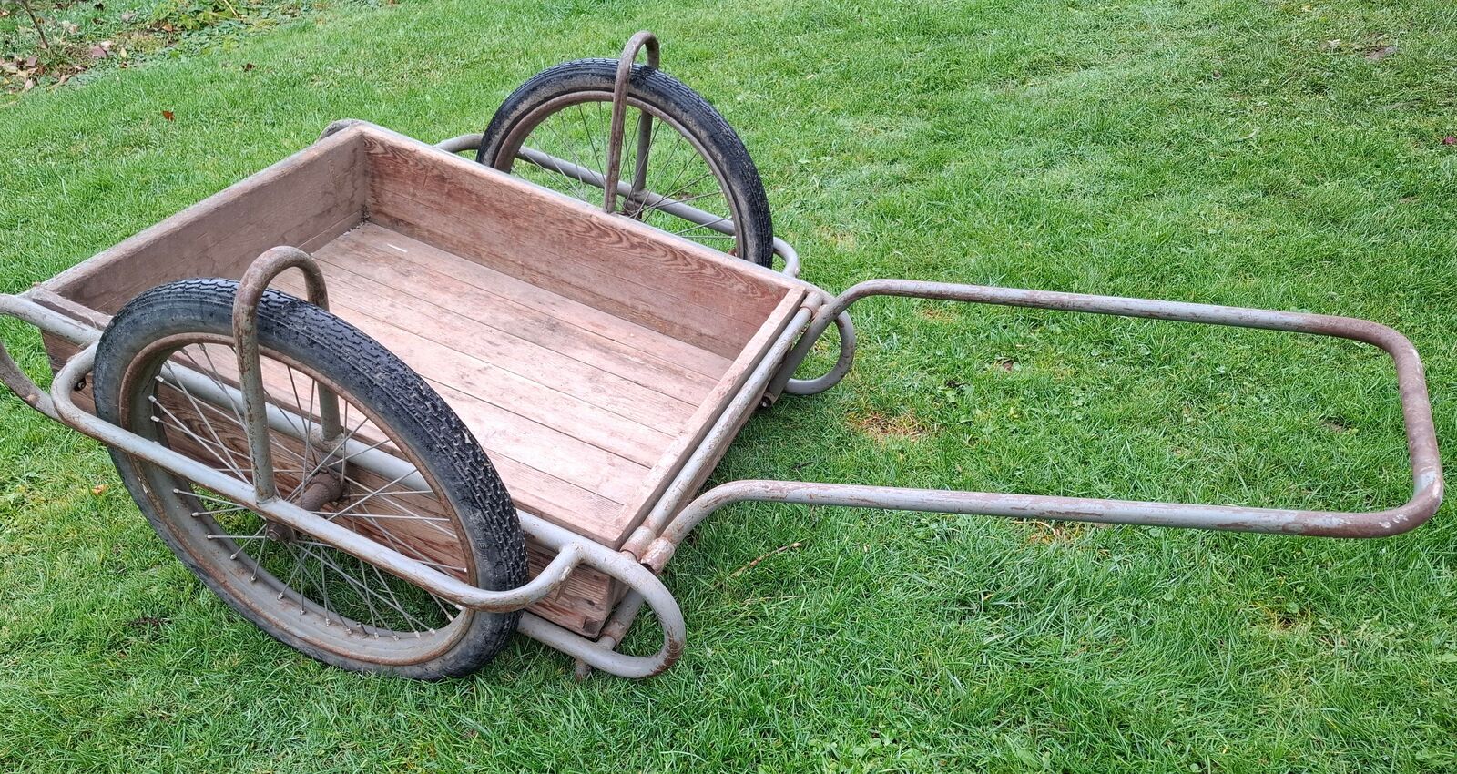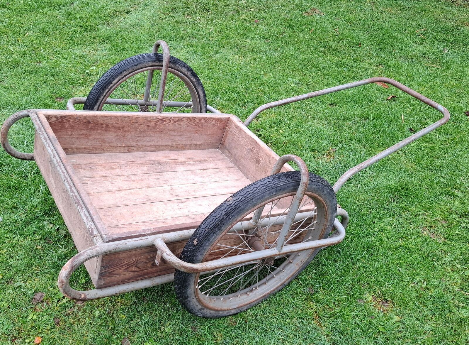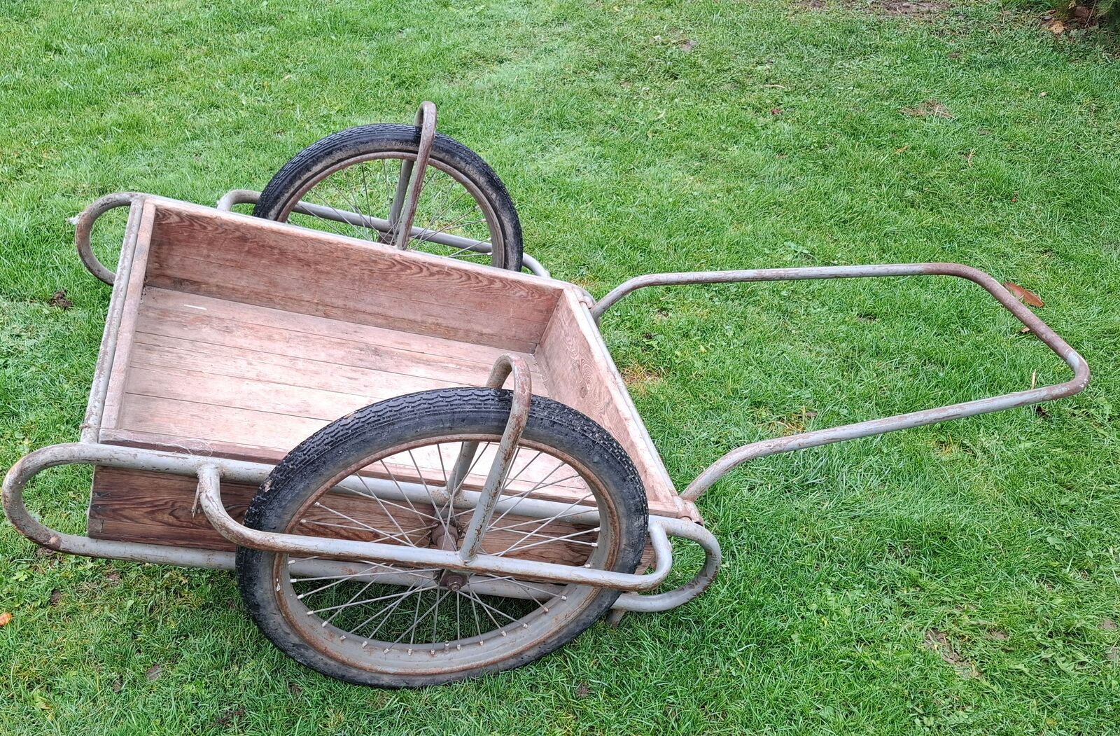Predám prepravný vozík - káru. Ručný dopravný vozík je vyrobený z oceľových trubiek na kolesách s pneumatikami 2,25x19". Nosnosť: 240 kg vypletané oceľovými špicami duša + plášť 21/4-19 vonkajší priemer kolesa 60 cm