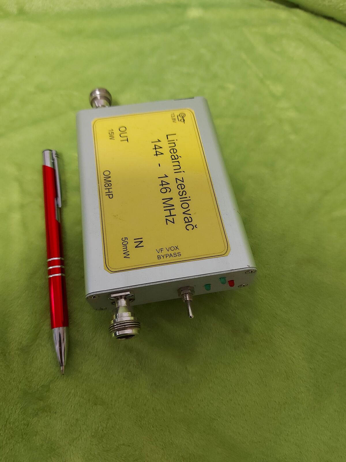 Malý 20ti watový VF signál z PA . Je osazen Integrovaným obvodem Motorola ,na výstupu je filtr výstupního signálu , a zesilovač pracuje v lineárním režimu ,tedy vhodné i pro signály SSB.Zesilovač má VF vox, který je ovládán z předního panelu. Zasilovač obsahuje i výkonové VF relé na přepínání Vox a bypas.Při příchodu vF signálu na vstup je automaticky sepnuta TX cesta na vysilání .Netreba žádné ovládací kabely.Funkce Bypas je pro průchod signálu bez zesílení .Po skončení vysílání se automaticky přepne na příjem. Na zadním panelu je automatický ventilátor ,který spíná po dosažení nutnosti chladit Integrovaný ovvod.Napájení je externím zdrojem 12-16V .PSW při Bypasu je 1:0,4 .