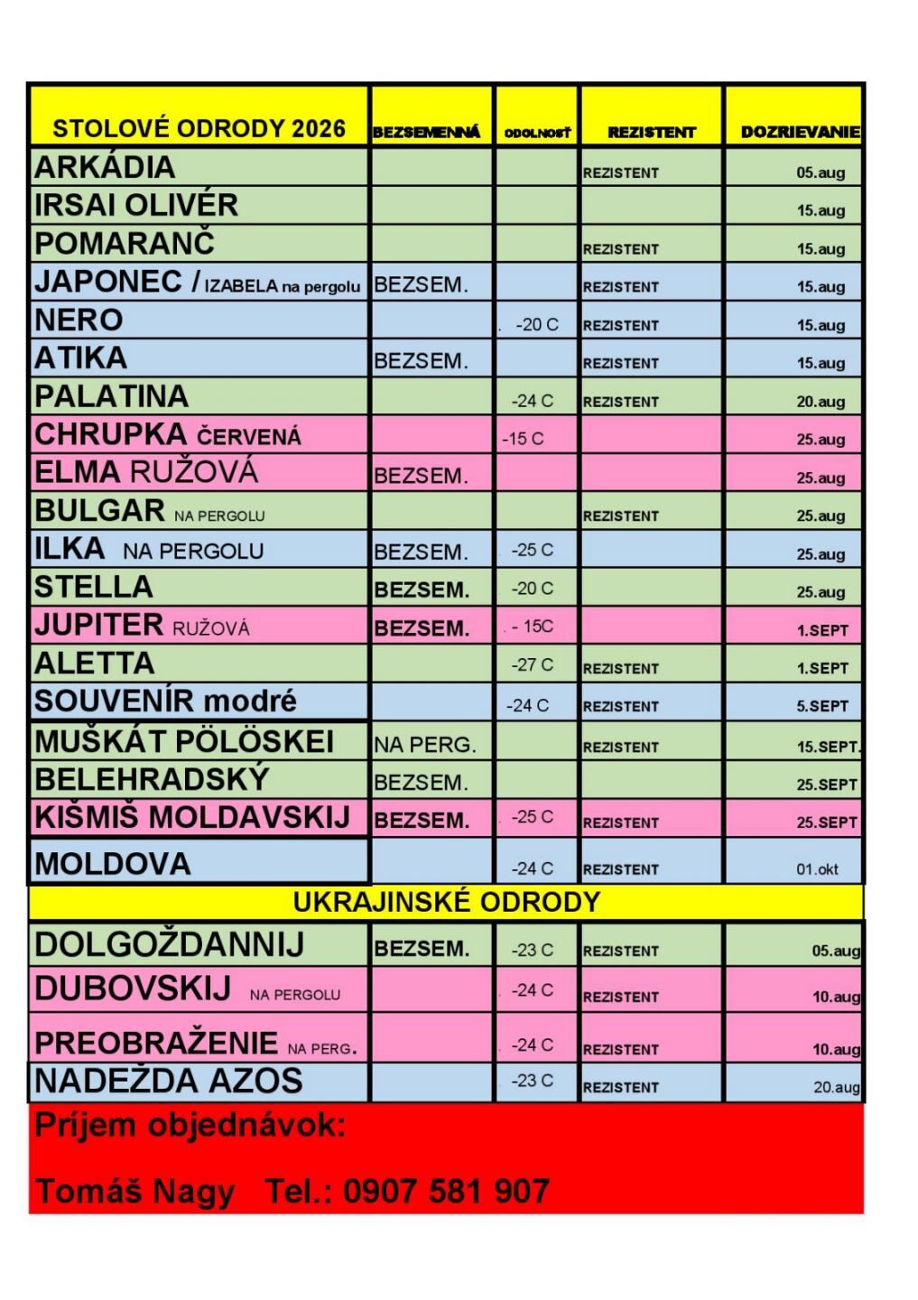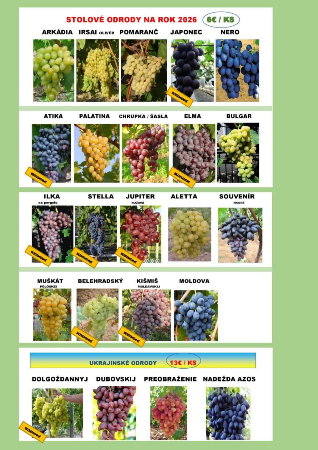 ARKÁDIA, IRSAI OLIVÉR , POMARANČ, JAPONEC / IZABELA na pergolu/, NERO, ATIKA, PALATINA, CHRUPKA červená, ELMA ružová, BULGAR na pergolu, ILKA na pergolu, STELLA, JUPITER ružová, ALETTA, SOUVENÍR modré, MUŠKÁT PÖLÖSKEI, BELEHRADSKÝ, KIŠMIŠ MOLDAVSKIJ, MOLDOVA. Ukrajinské odrody: (13eur/ks) DOLGOŽDANNIJ, DUBOVSKIJ, PREOBRAŽENIE na pergolu, NADEŽDA AZOS. Posielame aj na dobierku.