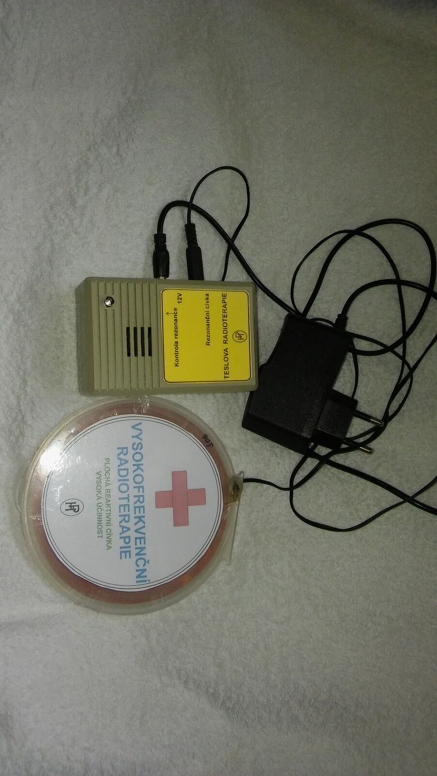 Léčebný radioterapeutický přístroj s plochou reaktanční rezonanční cívkou, která je složena z několika specielně vinutých cívek ,je založen na principu reaktančního rezonančního obvodu s velmi vysokým“ Q „to je s vysokou VF elektrickou kvalitou obvodu, který zajišťuje přenos kmitočtu do vysílací cívky naladěné na kmitočet,kde rezonuje .Výkon na cívce je dostatečný pro průnik do tkání.Přístroj je vyroben s pomocí elektronickobiochemické lab. v IKEMu Praha,kde jsem pracoval jako konzultant.Tech.parametry při koupi přístroje dodám.