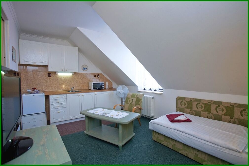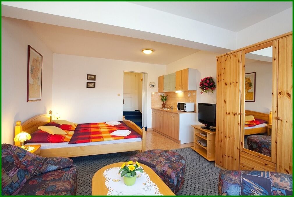 Vlastní sociální zařízení, TV se satelitním příjmem, minibar a chladnička, rychlovarná konvice, mikrovlnka a nádobí, rychlé Wi-Fi připojení zdarma v celém objektu.