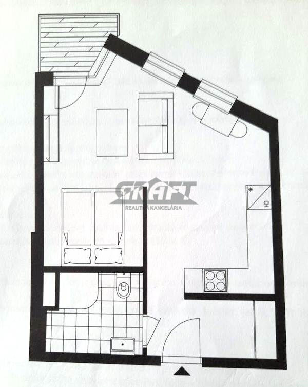 Byt pozostáva zo vstupnej chodby s veľkou vstavanou skriňou (rolldor). Z chodby je vstup do priestrannej obývacej izby spojenej s kuchynským kútom, do kúpeľne spojenej s WC a do spacieho kúta, ktorý je prakticky oddelený priečkou.