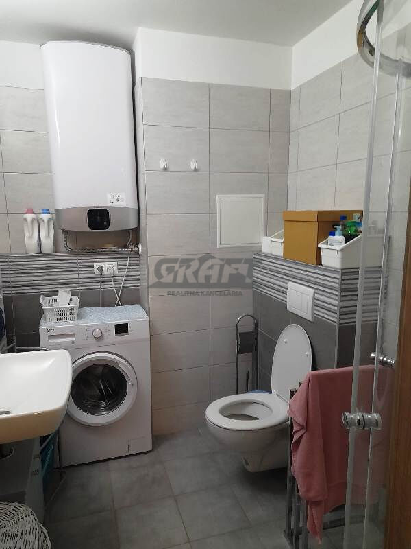Kúpeľňa je vybavená sprchovým kútom, umývadlom a WC. Nachádza sa tu aj bojler na samostatné kúrenie a ohrev vody.