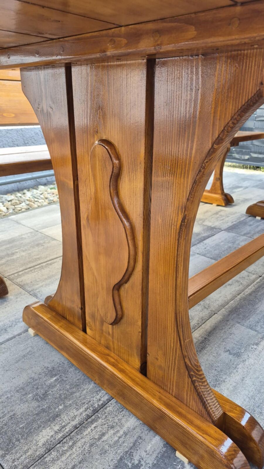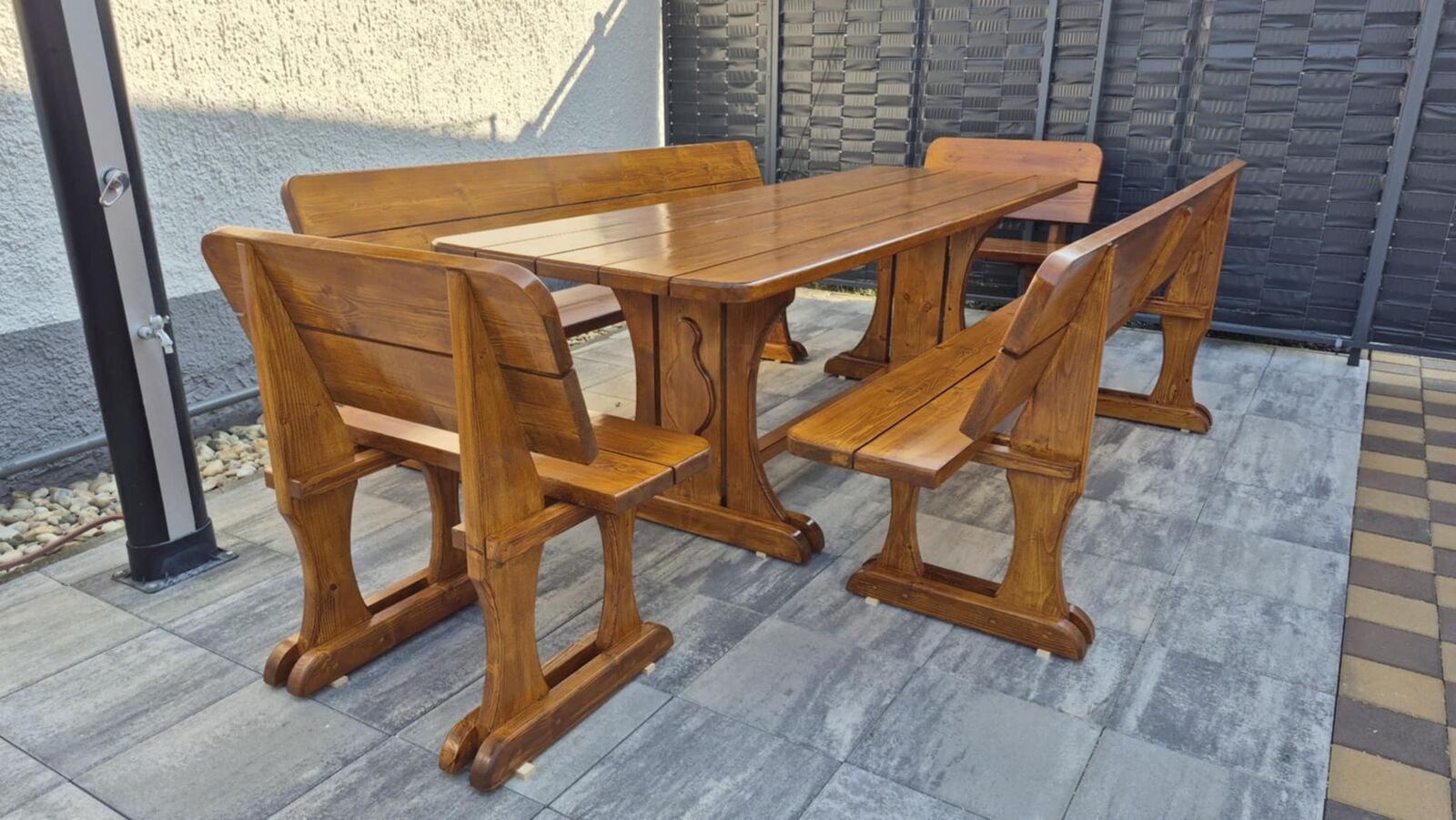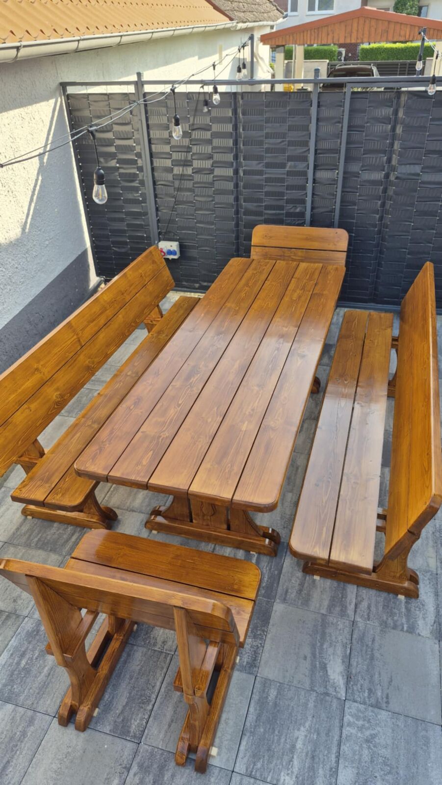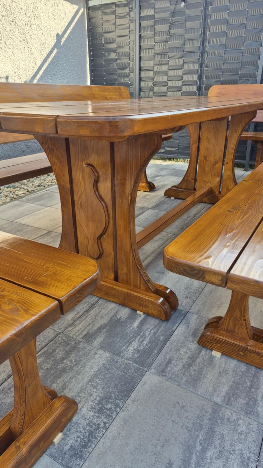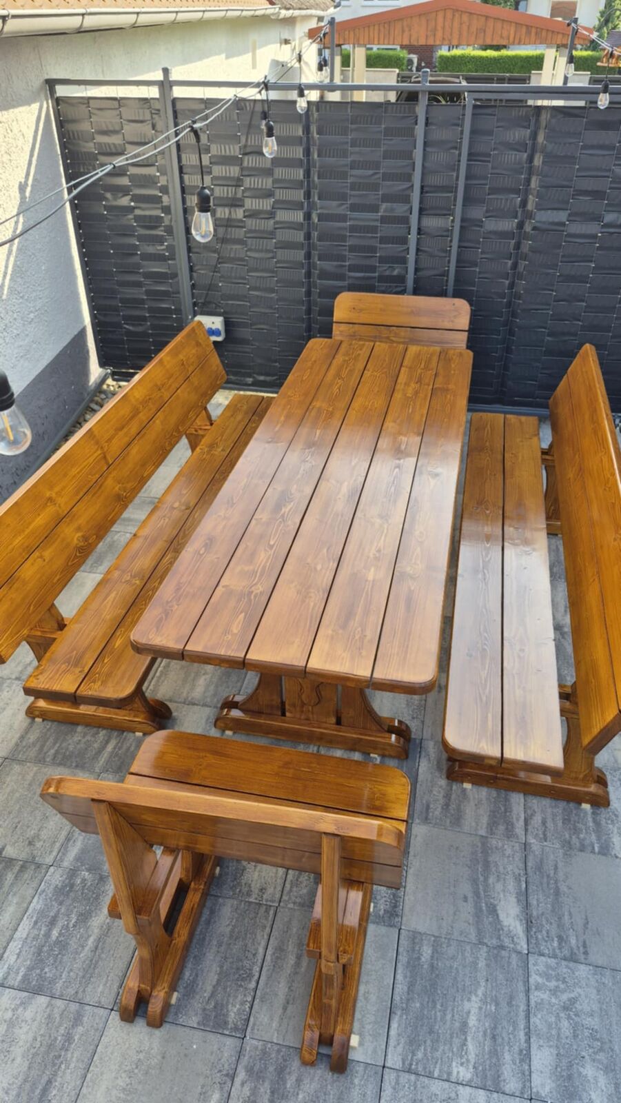 Predám masívne záhradné sedenie pre 16 osôb. Dĺžka stola 2,70 m 3 krát náter Belinka Cena 1000, - eur